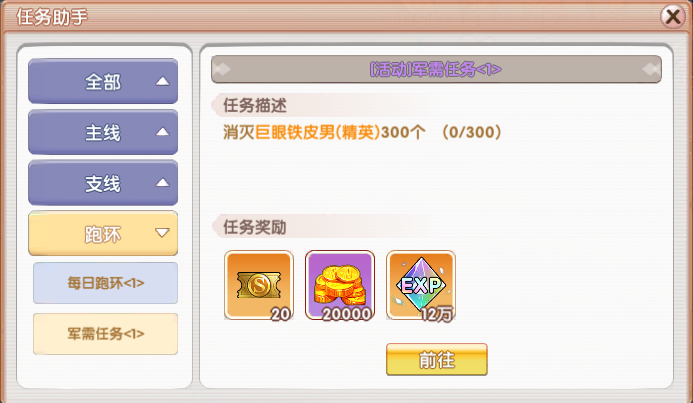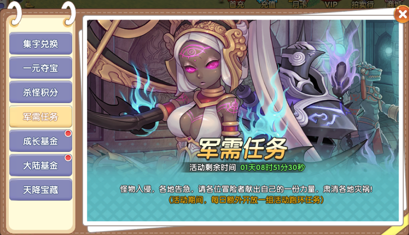 活动期间,每日额外开放一组跑环-军需任务。完成军需任务可得夺宝积分、金币以及大量游戏经验,军需任务具有一定的挑战性,每日0点重置,各位冒险家们及时参与哦!