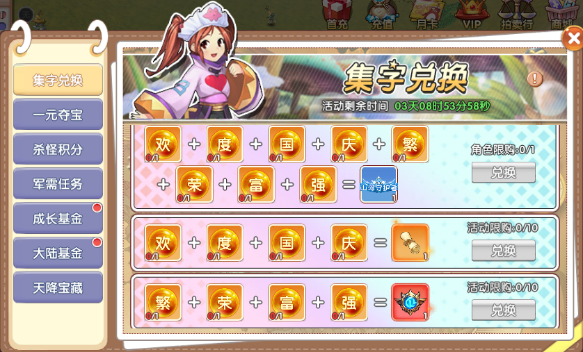 文字道具可兑换「称号·山河守护者」、「保护卷轴」、「英雄徽章」、「宝石随机箱」等丰厚奖励。
