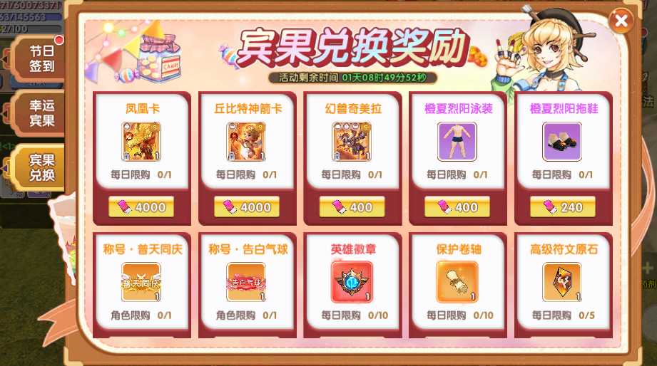 开启幸运宾果有概率开出宾果礼券,「宾果礼券」可在宾果兑换商店兑换:「称号·普天同庆」、「永恒保护卷轴」、「丘比特神箭卡」、「橙色符文随机箱」等海量稀有资源。