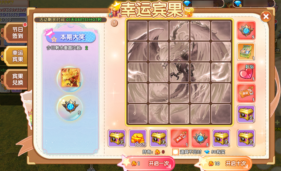 「幸运宾果」每日可重置两次,让惊喜翻倍!每次开启均有累积次数保底,未开启的格子终将解锁。