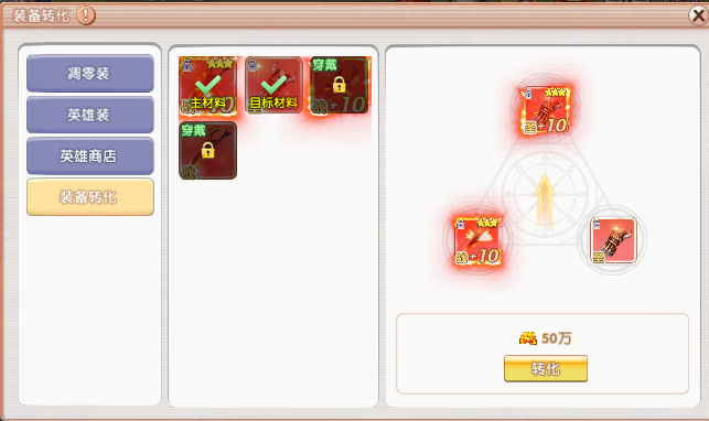 2. 新增“装备转化”功能,位于“打造”功能内,可使用已升星红色装备和想转化装备转化为目标装备,详情参照功能内介绍;