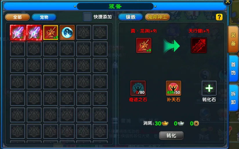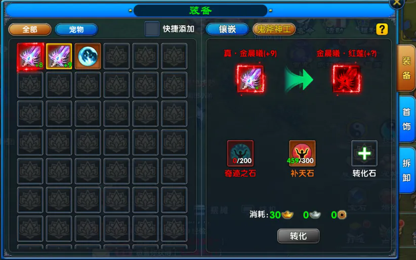 开放100级奇迹装备,可通过鬼斧神工系统将90级真绝世、真圣武进阶为100级奇迹装备。