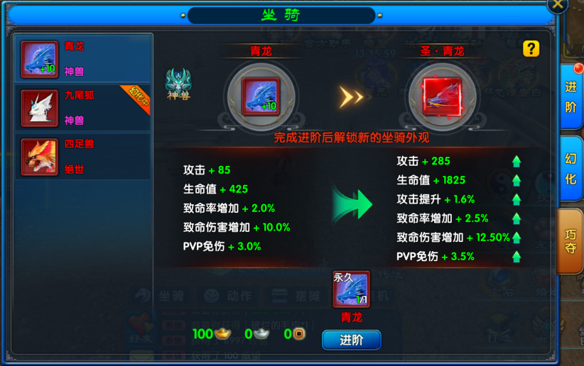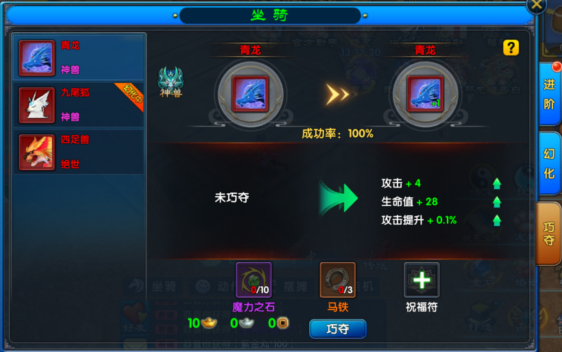 3、目前仅有【神兽】系列坐骑可以进行进阶,其他坐骑只可以进行巧夺养成;